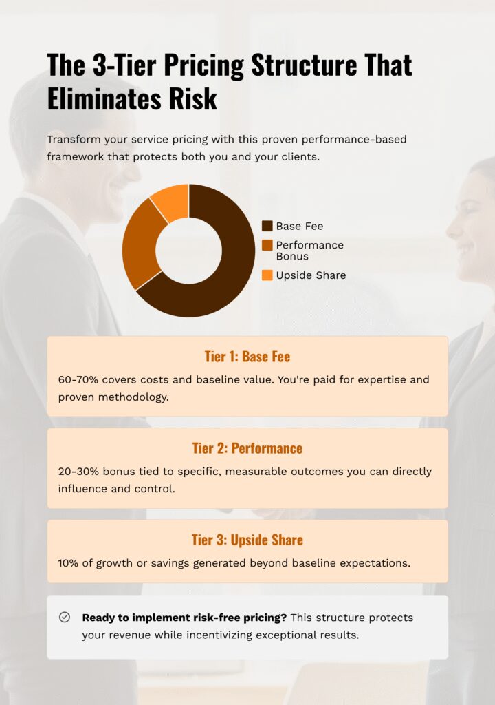 Tier 1: Base Fee (60-70%) covers your costs and baseline value delivery – what you’d typically charge for the methodology, expertise, and professional execution. This is paid regardless of performance outcomes.