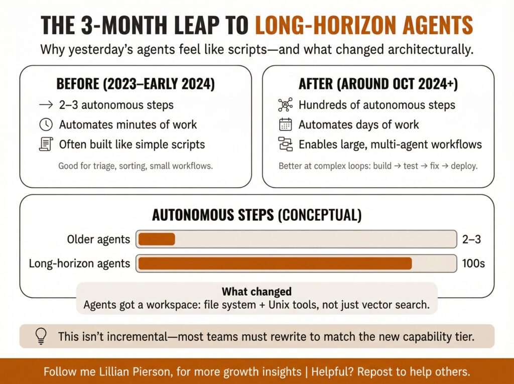 Starting around October 2024, agent capabilities crossed a threshold. New architectural approaches enable agents that can execute hundreds of autonomous steps. These “long-horizon agents” can automate days of work instead of minutes.