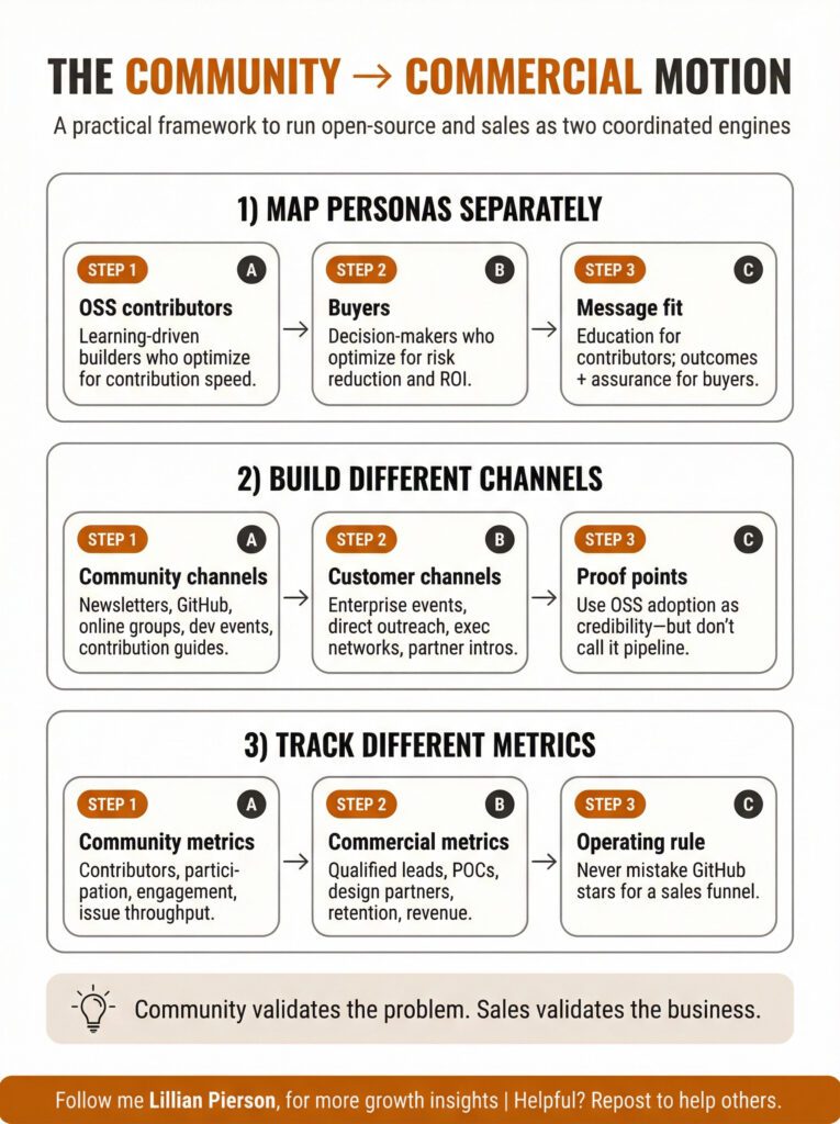 - Track community and commercial metrics separately. Don’t confuse GitHub stars with pipeline. Community metrics validate the problem and improve the product. Commercial metrics prove you have a business. Both matter, but they are different funnels and require different strategies.