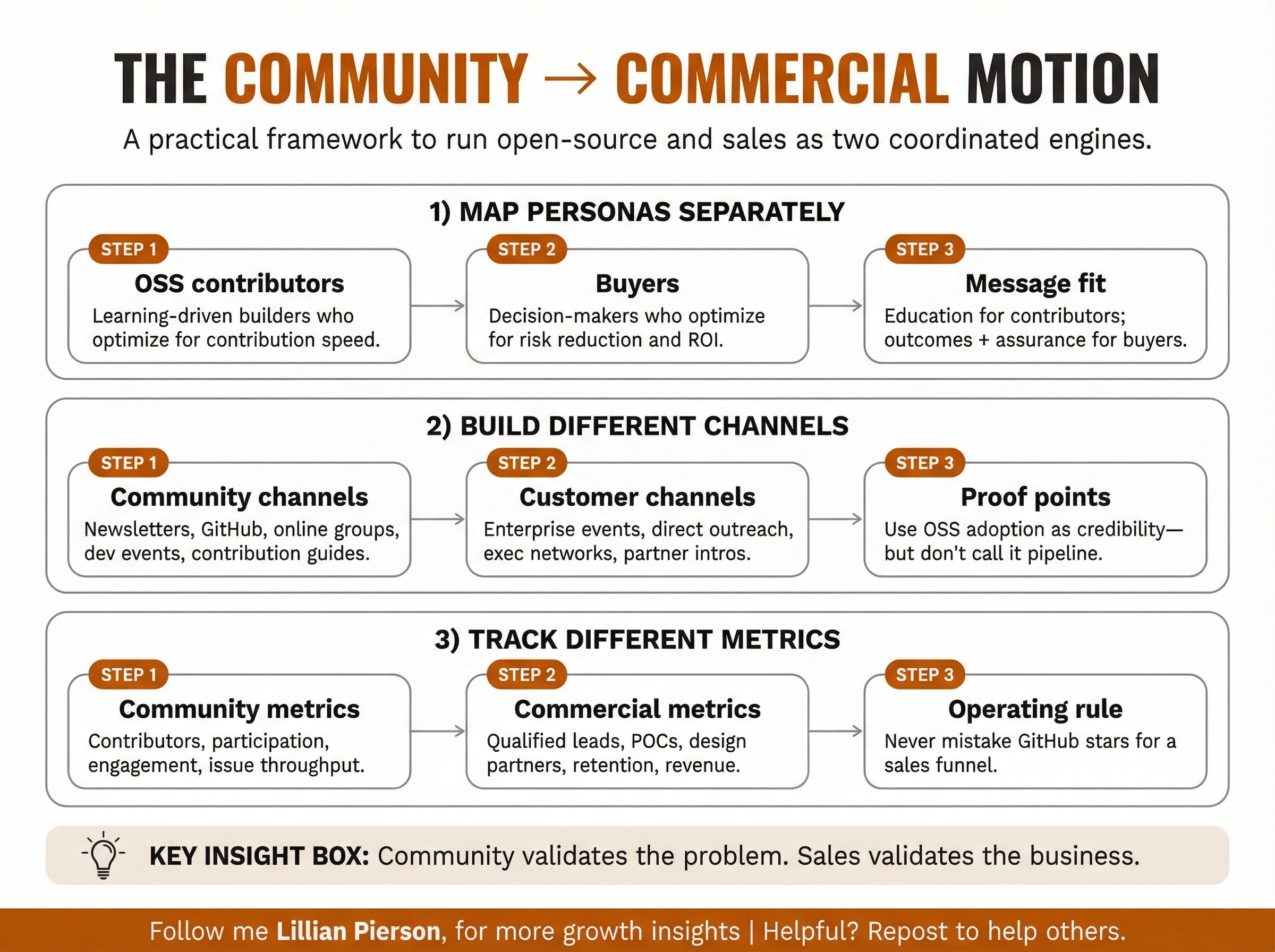 - Track community and commercial metrics separately. Don’t confuse GitHub stars with pipeline. Community metrics validate the problem and improve the product. Commercial metrics prove you have a business. Both matter, but they are different funnels and require different strategies.