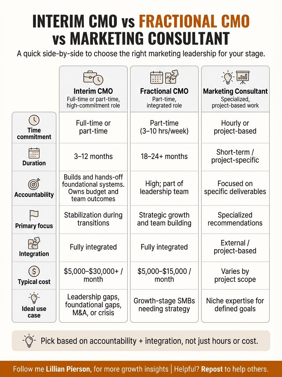 Interim CMO vs Fractional CMO vs Marketing Consultant Comparison