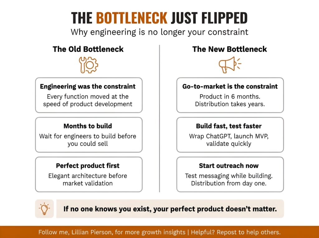 Here’s the broader lesson: The bottleneck shifted from engineering to go-to-market, but most founders are still operating like it’s 2015. They’re perfecting the product, optimizing the architecture, waiting for the right moment to “do marketing.”