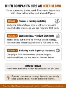 • You’re scaling from Series A to Series B (roughly $2M to $10M ARR) and need to professionalize your marketing function before your next raise, which interim CMO services provide.